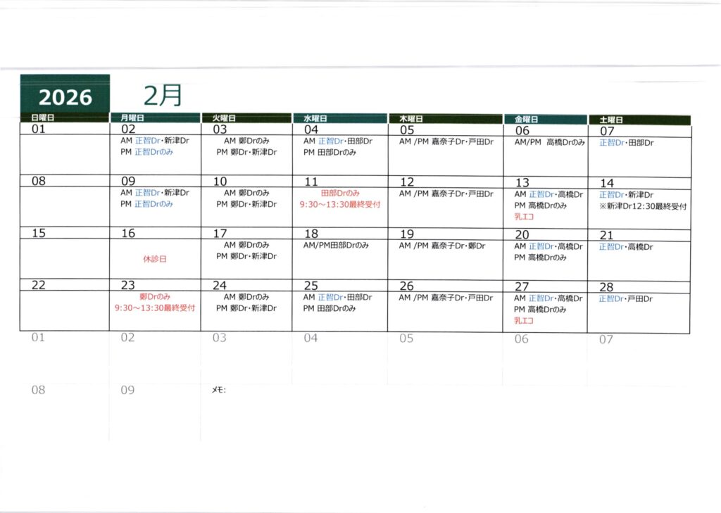 2月診療スケジュール表(1/26更新)